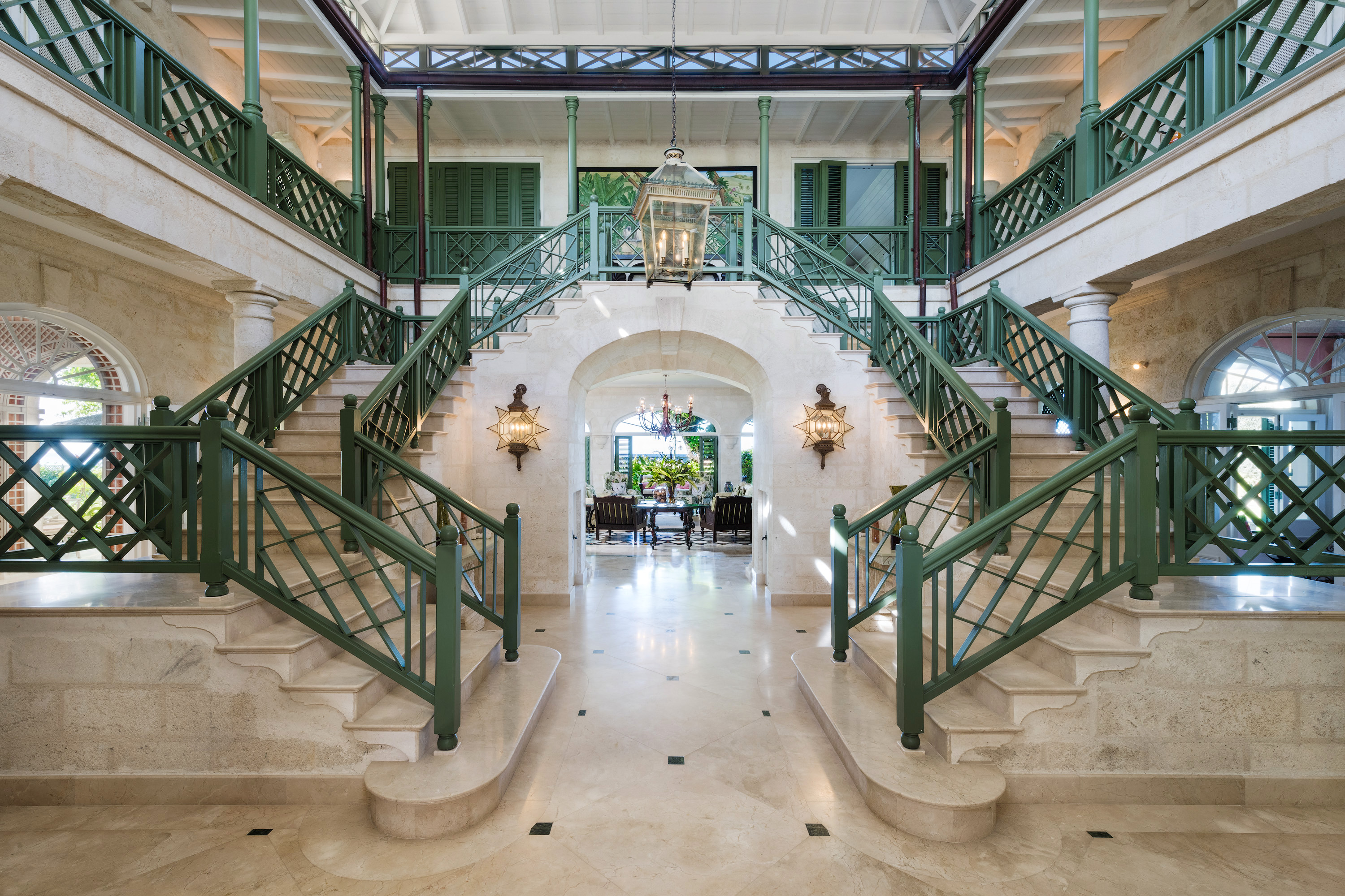 Poised majestically along one of the most sought-after west coast beaches in Barbados lies Four Winds, a Palladian-style estate gracing the pristine white sands of Gibbs Beach with an impressive 350 sq. ft. of beach frontage. The arrival experience is nothing short of regal, as a sweeping driveway elegantly tiled with coral stone leads to the estate’s welcoming foyer. Stepping into the main house, one is immediately greeted by the grandeur of a traditional Barbadian-style residence adorned with a striking double staircase.