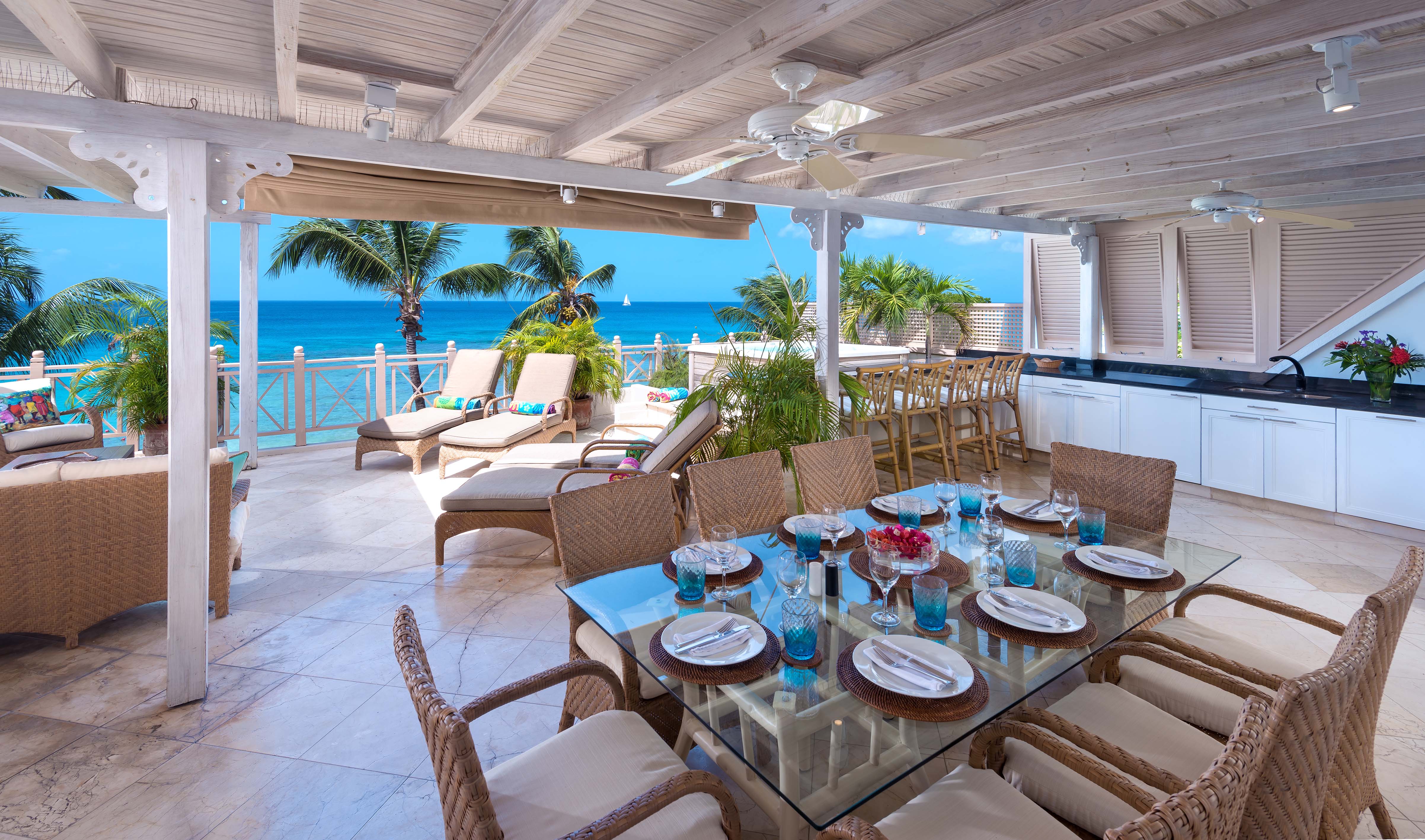 The master bedroom is beautifully furnished with a king size four-poster bed and has the benefit of en-suite facilities, marble fittings, a large corner bath, a separate shower room and leads onto a private sitting area with wet bar. All bedrooms are air-conditioned and have ceiling fans. The second floor boasts a magnificent 55 foot private roof terrace, which is probably the largest in Barbados. A covered dining area for eight people with wet bar and ice maker leads onto the sun terrace where you can relax on comfortable designer sun-beds and several seating areas or relax in the large spa-pool. This floor also has a third air-conditioned bedroom/sitting room with an immaculate en-suite shower room.