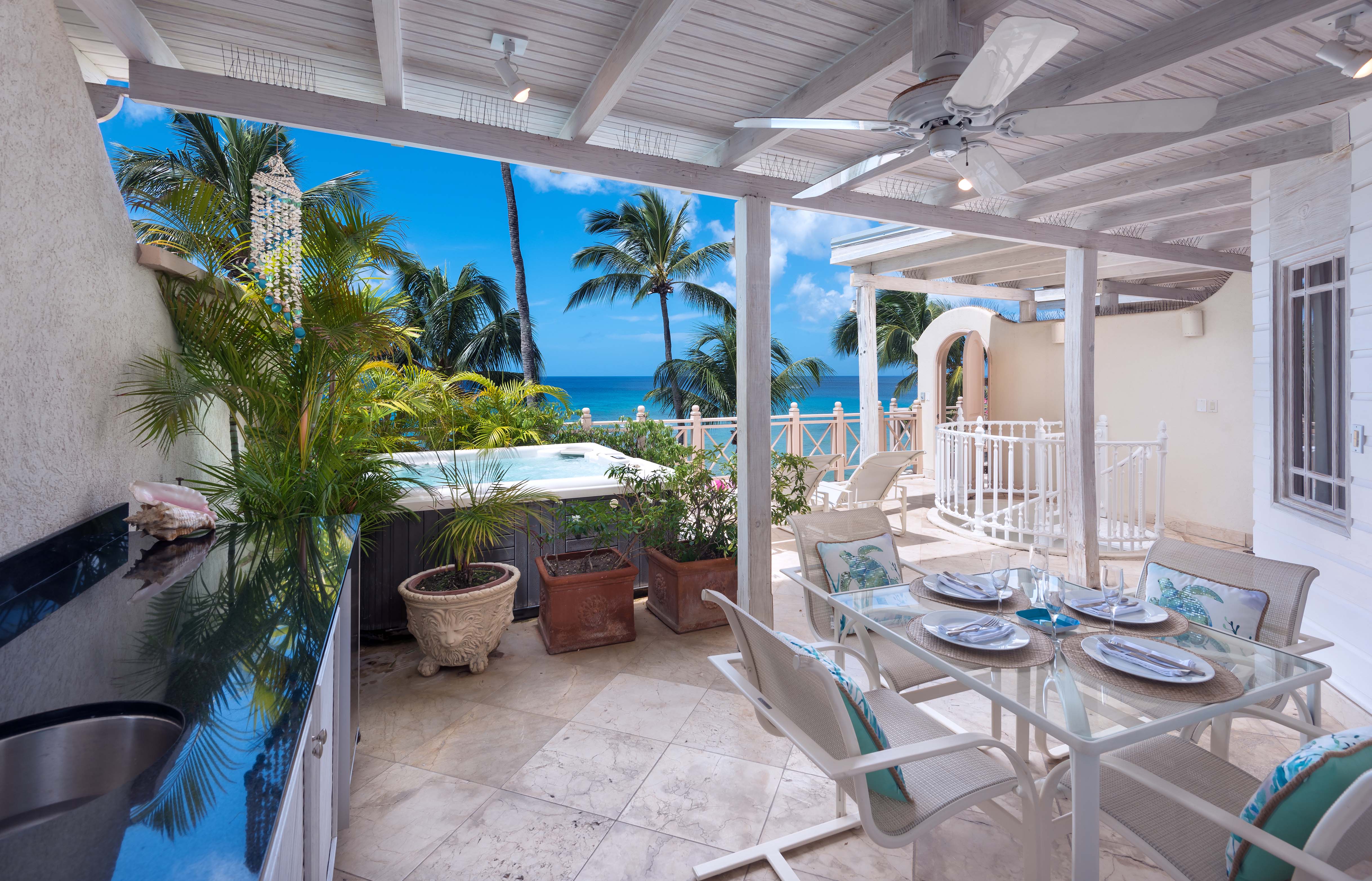 With panoramic views from every room, this newly refurbished penthouse provides luxurious accommodation for 2/4 people. A well-appointed kitchen opens onto the living room where you can relax and watch satellite TV, a video or listen to music. The sofa in the living room can be turned into a bed for an extra person and the adjoining small covered dining terrace overlooks the peaceful Caribbean Sea. The master bedroom is beautifully furnished with a king size bed and has the benefit of en-suite facilities, marble fittings, large corner bath, a separate shower unit and a double vanity unit. The room has a walk-in closet and a small terrace overlooking the immaculate gardens, beach and sea. The second floor boasts an exquisite private roof deck with thriving tropical plants. A second bedroom has recently been added, offering queen bed and spectacular views of the sunset. A covered dining area with wet bar leads onto the sun terrace where you can relax on comfortable sun-beds or step into your private spa-pool. Penthouse No.13 can be rented with Penthouse No. 14 to accommodate a larger group as the two penthouses have inter-communicating doors.