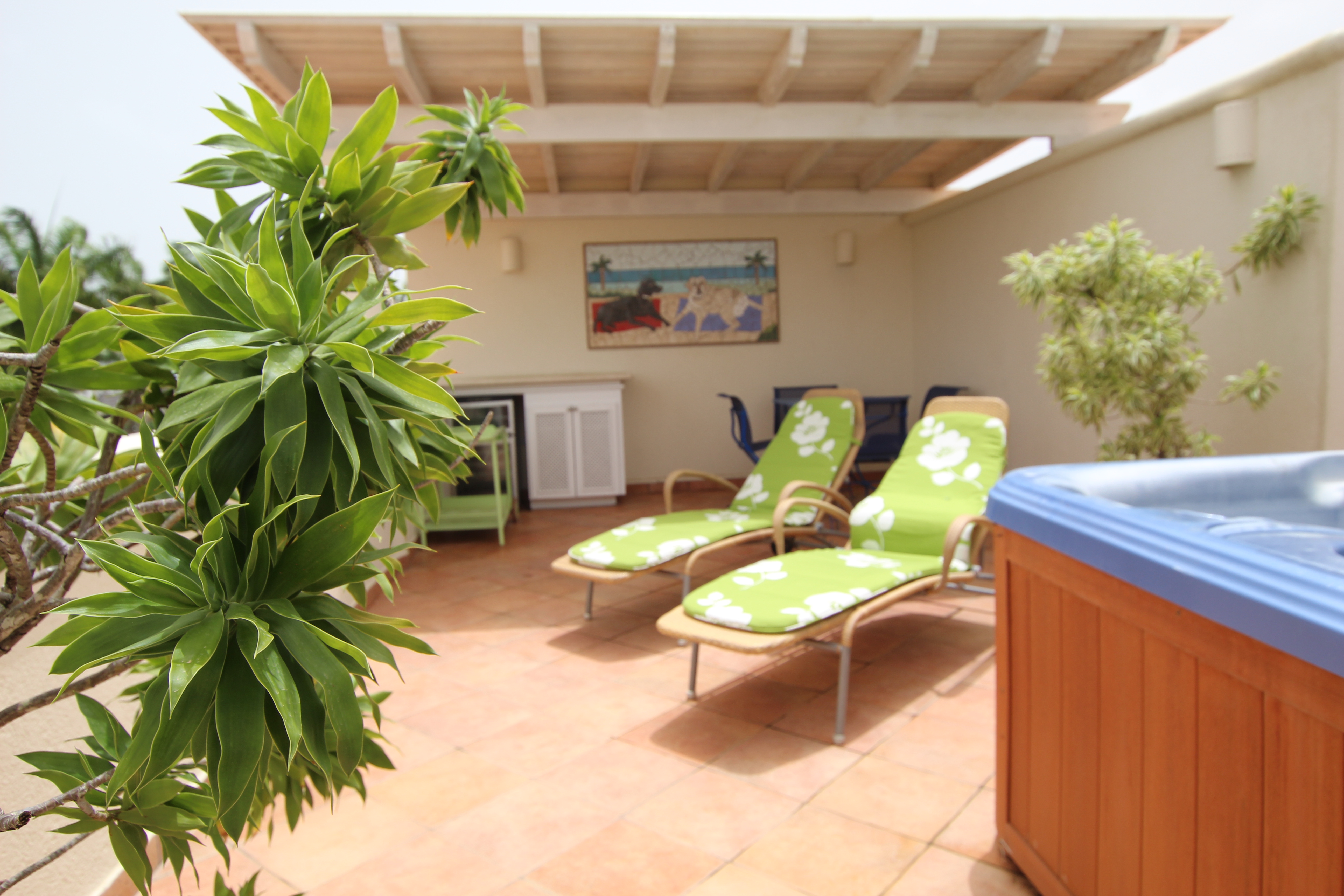 The Palms is a tastefully furnished, two ensuite bedroom penthouse apartment overlooking one of the two pools and beautiful gardens within the exclusive Sugar Hill Estate. Located on the second floor, this approximately 1700 sq. ft. unit also benefits from an additional private sun deck on the floor above. Complete with loungers and jacuzzi to enjoy the sun and stars, this elevated position provides panoramic views of the Caribbean and wonderful sunsets. The spacious open-plan design, set east/west allows cool breezes to blow through the property if desired with ceiling fans throughout and air-conditioning in both bedrooms. The main living area opens onto the dining terrace via French doors whilst the kitchen is fully fitted with all necessary appliances for self-catering and with an adjacent utility room complete with washer/drier. The two double bedrooms, situated at either side of the property, provide complete privacy and each feature built-in wardrobes with additional French doors to the dining terrace. Maid service is complimentary and provided on three days each week.