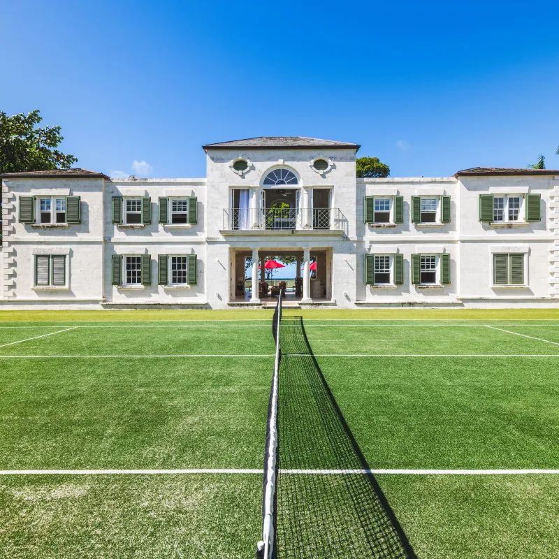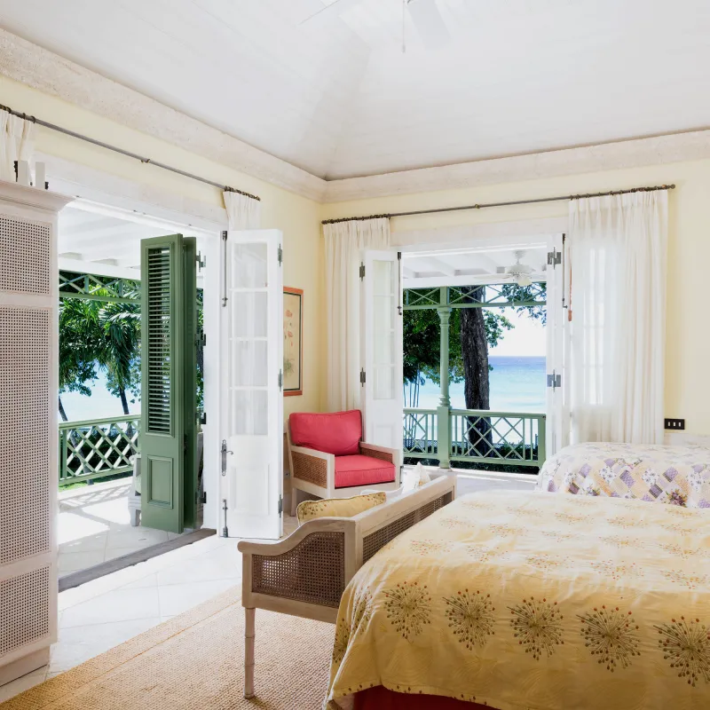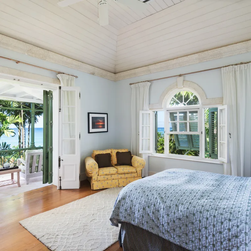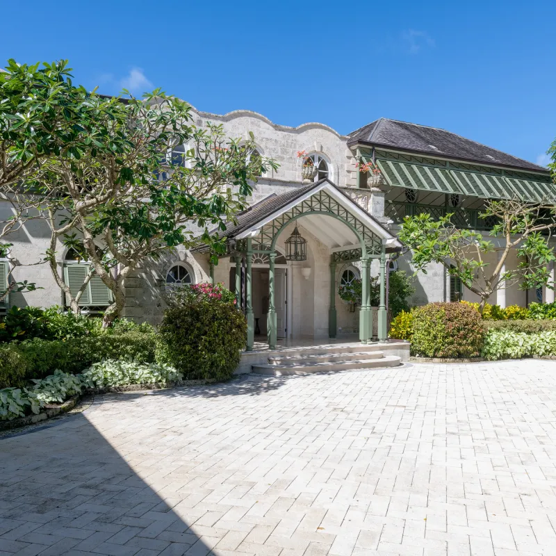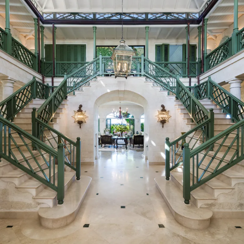 Poised majestically along one of the most sought-after west coast beaches in Barbados lies Four Winds, a Palladian-style estate gracing the pristine white sands of Gibbs Beach with an impressive 350 sq. ft. of beach frontage. The arrival experience is nothing short of regal, as a sweeping driveway elegantly tiled with coral stone leads to the estate’s welcoming foyer. Stepping into the main house, one is immediately greeted by the grandeur of a traditional Barbadian-style residence adorned with a striking double staircase.